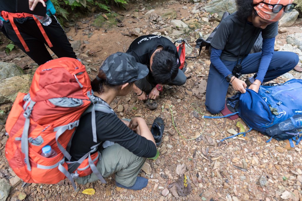 เดินมาได้ซักพักก็เกิดเหตุสุดวิสัยขึ้นคือรองเท้าของน้องในทีมพื้นหลุด ตรงสาเหตุน่าจะมาจากการที่นำรองเท้ากีฬามาเดินป่า พอเดินหนักๆ ลุยน้ำหนักๆ ปีนปายหนักๆเข้า น่าจะทำให้กาวที่ยึดพื้นหลุด ซึ่งครั้งนี้แก้ปัญหาโดย หัวหน้าทีม(แอดมินเพจ) ถอดรองเท้าตัวเองให้น้องในทีมใส่เดินต่อ ส่วนเจ้าตัวใส่หูหนีบเดินต่อ