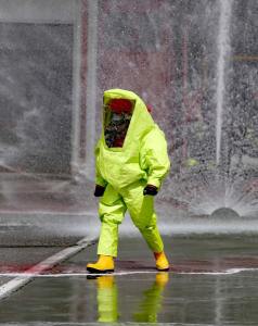 ชุด PPE ที่ใช้มี 4 ระดับหลัก (A, B, C, D) โดยระดับ A และ B จะใช้สำหรับเหตุการณ์ที่มีความเสี่ยงสูงสุดต่อชีวิต โดยชุดระดับ A เป็นชุดที่มีระบบปิดอย่างสมบูรณ์ (encapsulated) และมีระบบหายใจอิสระ (SCBA) ส่วนชุดระดับ B ให้การป้องกันสารเคมีสูงแต่ไม่เท่าระดับระดับ A ในการป้องกันทางผิวหนัง